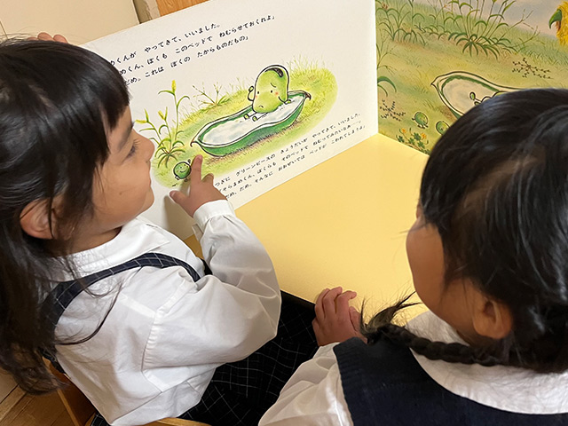 絵本の魅力の一つとして「想像力を刺激する」というものがあります。絵の助けももらいながら、物語に親しんだり登場人物の姿に興味関心を広げながら過ごします。また、絵本の世界を保育にも取り入れながら、「想像力や感性」を豊かにします。