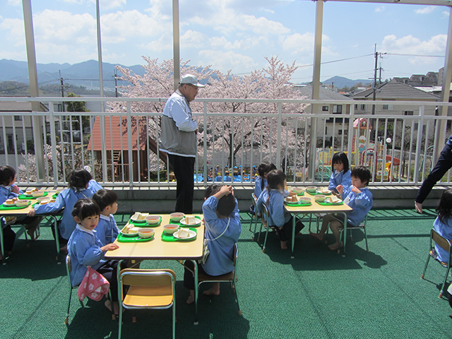 加古川に友愛会専用の畑があります。そこで、無農薬のお米を栽培し、定期的に旬の野菜が届きます。また、園内での野菜の栽培や果実の収穫、 管理栄養士による栄養指導などを通じて、「食を楽しみ」「食に関心をもって」過ごしていきます。